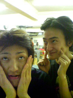 みなさんおかげプラスアルファー僕は血液型がO型のせいか!?すぐに前向きになれましたよ!みなさんからの励ましの声嬉しかったです(>_<)Thank you(^^)★ 今日の写真は、ミュージカル『葉っぱのフレディ』で今年僕がやった役を去年までやっていた事務所の先輩の菊地創さんです(←創さんは歌がめちゃめちゃ上手い方なんですよ!創さんと初めて知り合った日にすぐ仲良しになりました★僕とキャラが似てます!!)(^.^)…二人で変顔をしてしまいました(^_^;)誰?この左側のブサイクは!!って思いますよね(^_^;)僕です(:_;)ファンの方々ごめんなさい。イメージダウン!?やばっ(゜_゜まったまにはOK^^;